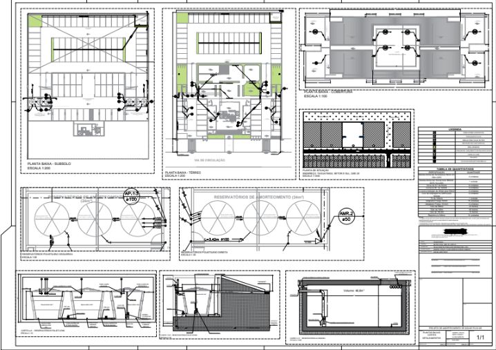 Nesse projeto foi feito um Projeto de Amortecimento de Águas Pluviais em um lote de 3.000m², para um edifício de 10 pavimentos, localizado no Setor D Sul, QSD 20, Lote 20, Taguatinga-DF. Foi elaborado um reservatório para ficar no subsolo do prédio, que não deverá ser enterrado.